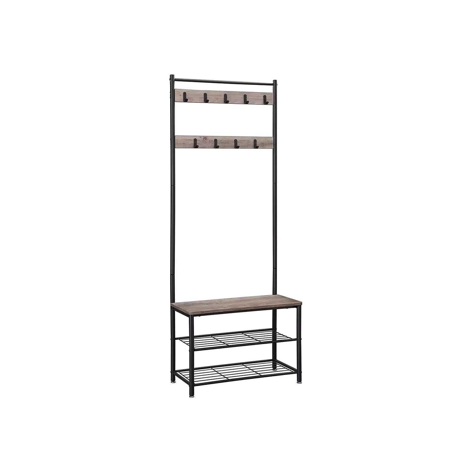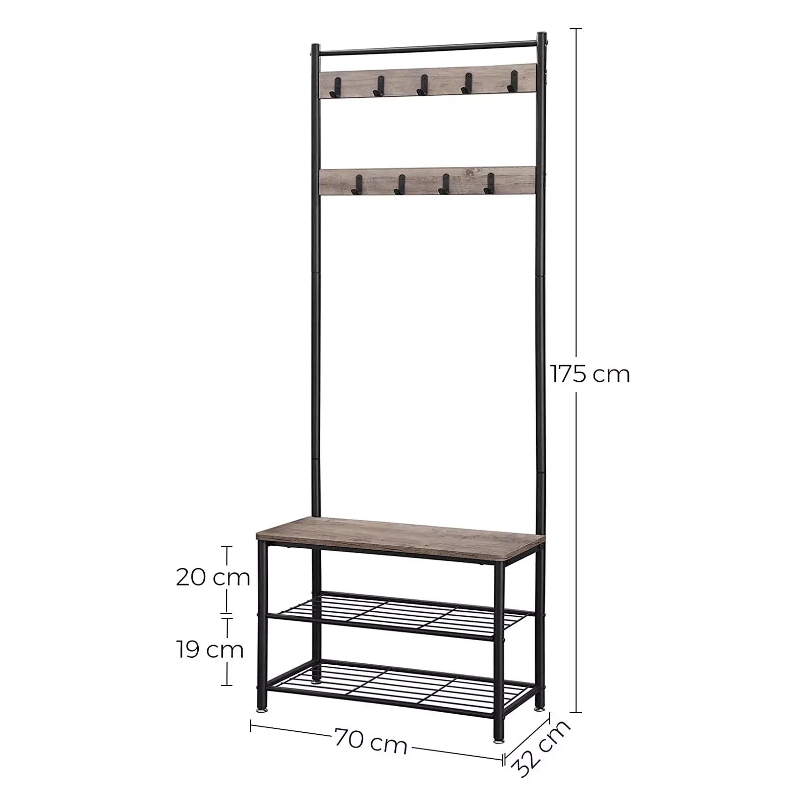 Productdetails: - Kleur: Greige-Zwart - Materiaal: spaanplaat, staal - Afmeting: 70 x 32 x 175 cm (L x B x H) - Afmeting zitting: 70 x 30 cm (L x B) - Gewicht: 7,8 kg - Max. statisch draagvermogen per haak: 3 kg - Max. statisch draagvermogen van de zitting: 80 kg Leveringsomvang: - 1 x kapstok - 1 x accessoirepakket - 1 x kantelbeveiliging - 1 x handleiding (DE, EN, ES, FR, IT)