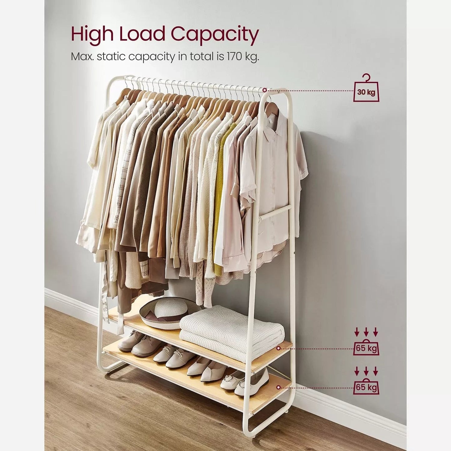 Productdetails: - Kleur: eikenwit - Materiaal: spaanplaat, staal - Afmeting: 45 x 100 x 160 cm (D x B x H) - Gewicht: 13,7 kg - Max. statische belasting van de kledingroede: 30 kg - Max. Statisch draagvermogen per haak: 5 kg - Max. statisch draagvermogen per plank: 70 kg - Max. statisch draagvermogen totaal: 170 kg Leveringsomvang: - 1 x kledingrek - 1 x accessoirepakket - 1 x handleiding Inand Outdoormatch Opmerkingen: - Om veiligheidsredenen mogen kinderen niet met het product klimmen of spelen.