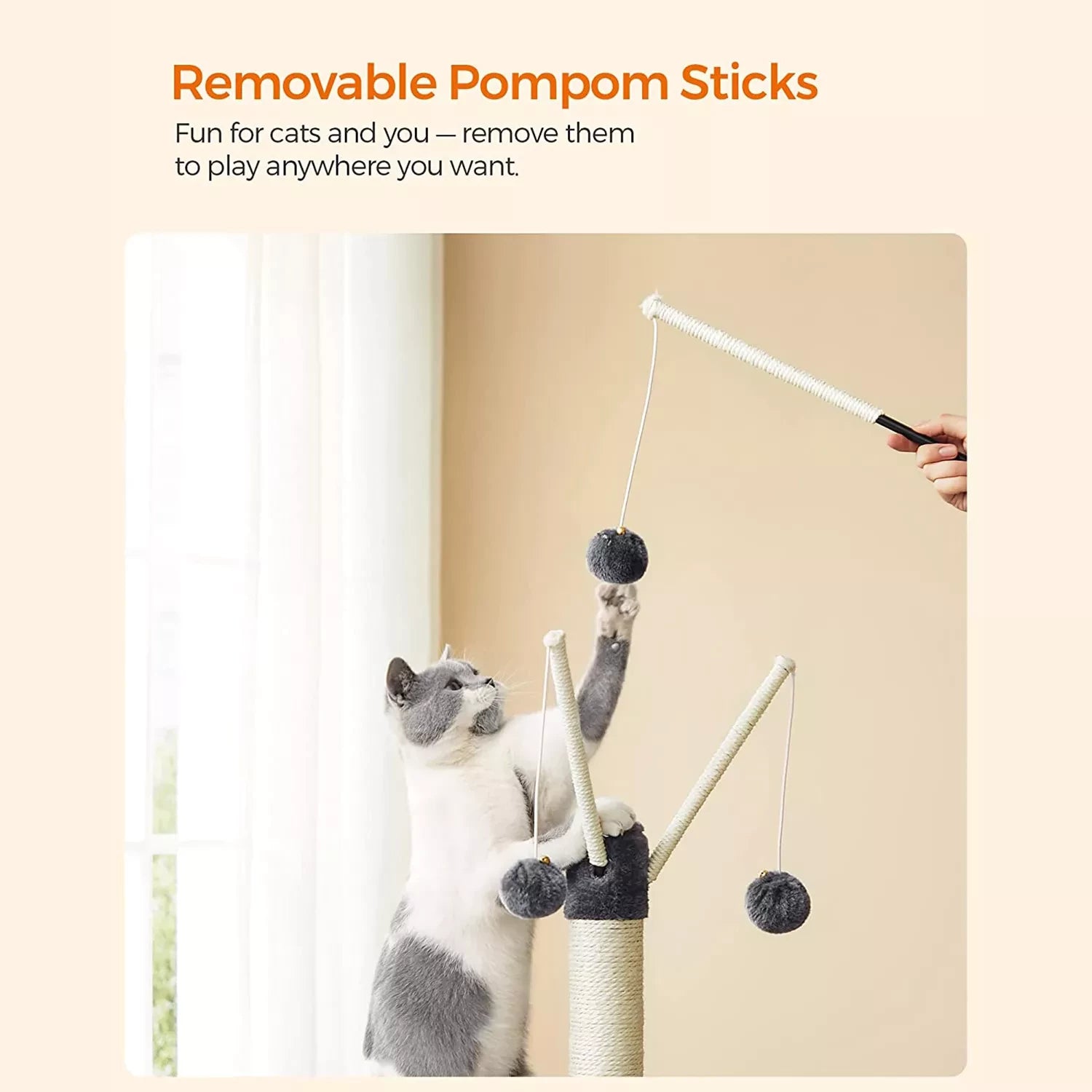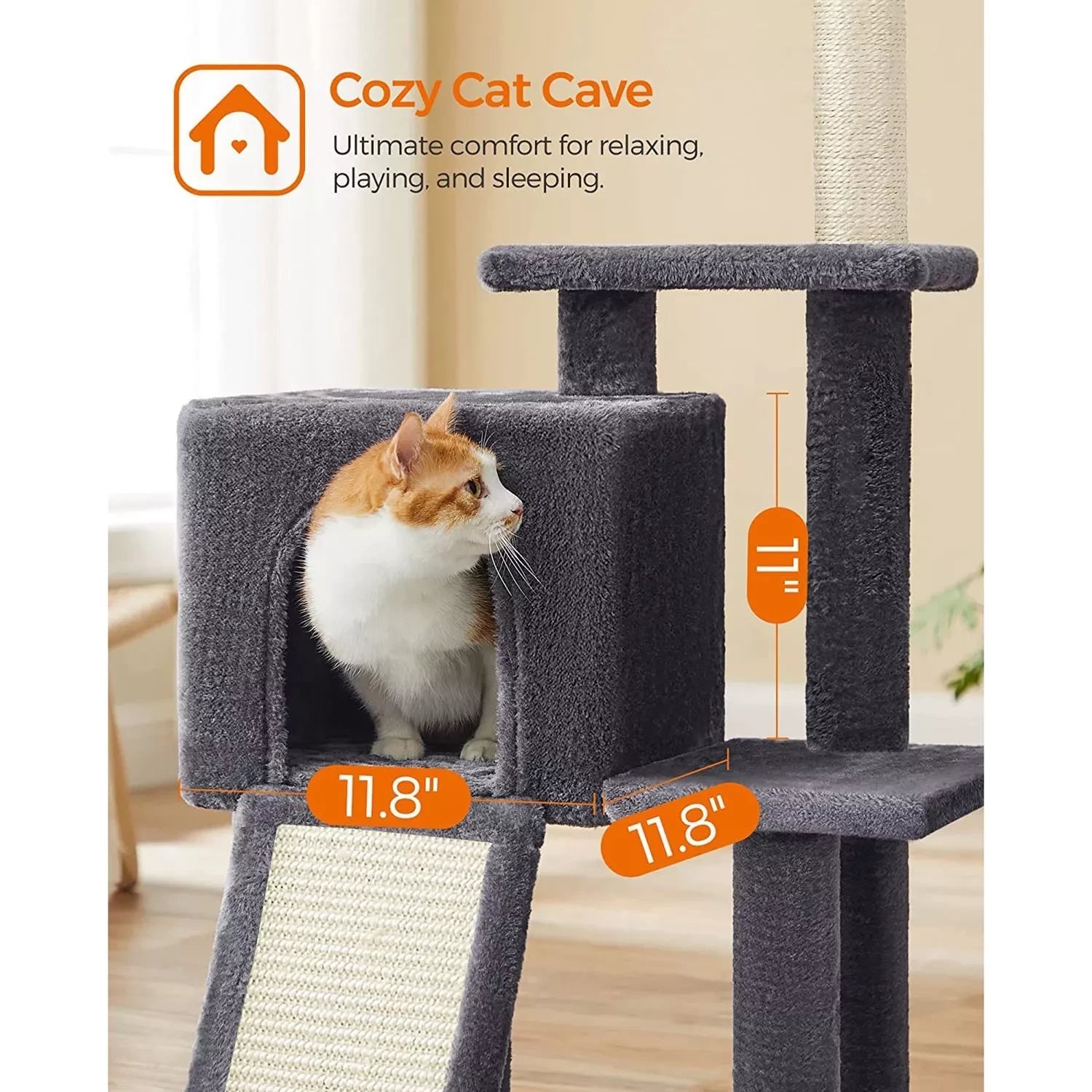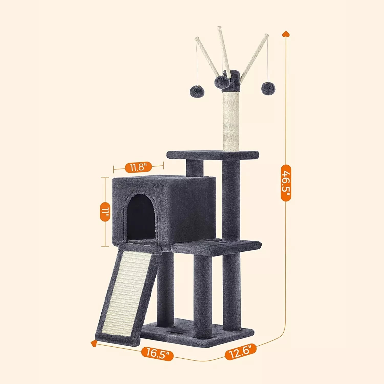 Waarom zou u voor deze meerlaagse krabpaal kiezen? - Stabiel en duurzaam: hoogwaardige materialen garanderen stabiliteit en duurzaamheid voor langdurig plezier. - Geschikt voor kittens en oudere katten: zowel het ontwerp met meerdere niveaus als de oprit maken het op- en afstappen gemakkelijk. - Rondom comfort: De gehele krabpaal is bekleed met zacht pluche, zodat uw katten zich overal op hun gemak zullen voelen. - Onbeperkt krabplezier: een grote krabplank en een sisalpaal scherpen de rusteloze klauwen aan. - Pluche ballen voor meer plezier: 3 pluche ballen garanderen plezier; een reserve pluchen bal zonder bel biedt nog een optie. - Afneembare accessoires: u kunt de pluchen ballen losmaken en gebruiken als kattenspeelgoed om met uw harige vrienden te spelen. Productdetails: - Kleur: rookgrijs - Materiaal: spaanplaat, pluche, sisal - Productafmetingen: 42 x 32 x 118 cm (L x B x H) - Gewicht: 6,6 kg - Max. totale statische belasting: 25 kg Leveringsomvang: - 1 x krabpaal - 1 x accessoirepakket - 1 x kantelbeveiliging - 1 x instructiesFEANDREA Opmerkingen: - Als uw katten op de haarbal of het elastiekje kauwen, verwijder dan het speeltje onmiddellijk en bewaar het op een plaats die niet toegankelijk is voor uw kat.- Als de kattengrot beschadigd is, repareer of vervang deze dan tijdig om het risico op letsel door beschadigde onderdelen te voorkomen.- Bevestig het product aan de muur met de anti-aanbaklaag. - Tip meegeleverd om de veiligheid tijdens het gebruik te garanderen. - Deze krabpaal is geschikt voor maximaal 2 katten met een gewicht van elk maximaal 7 kg.