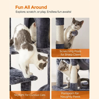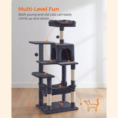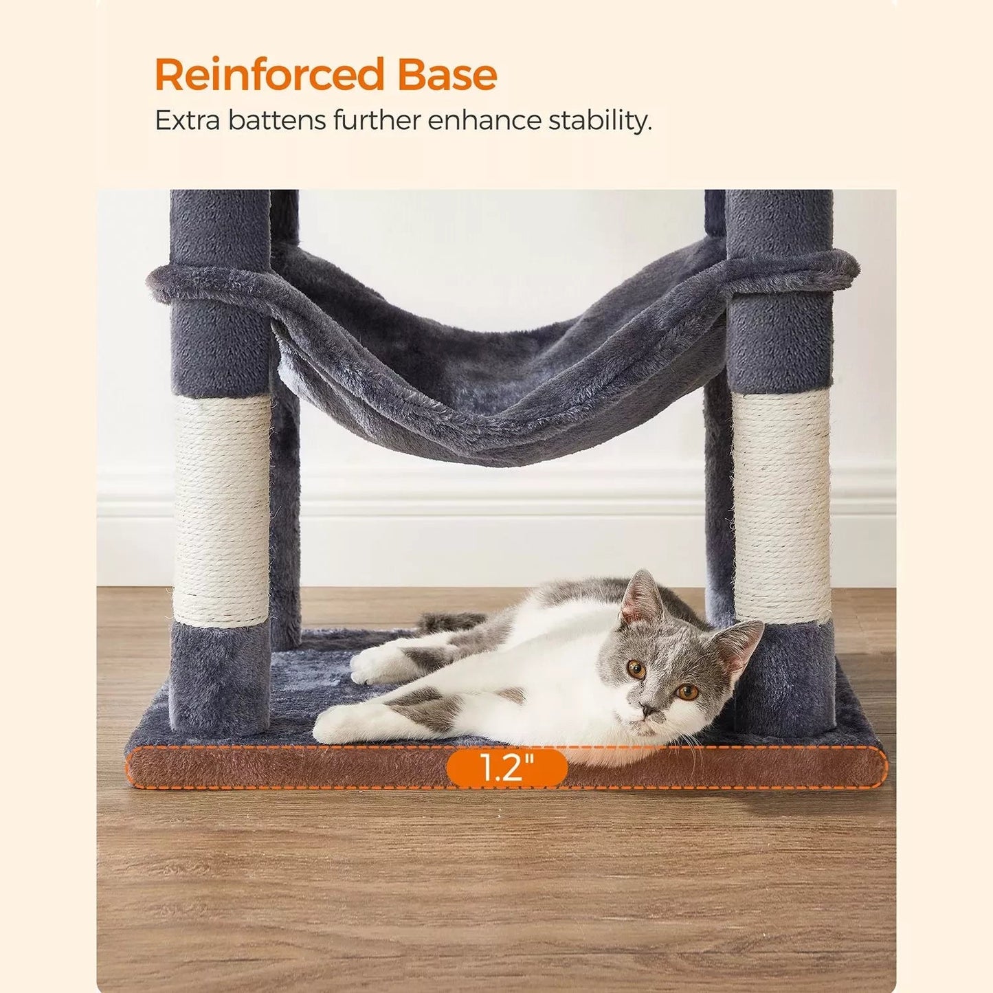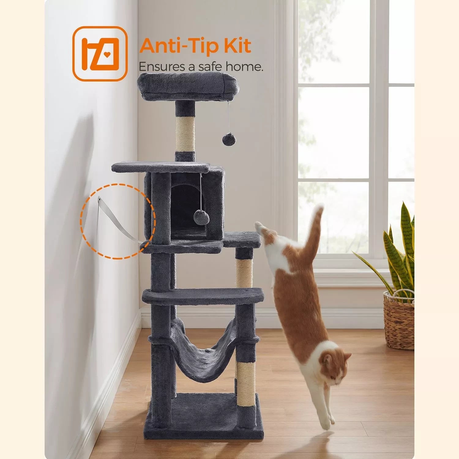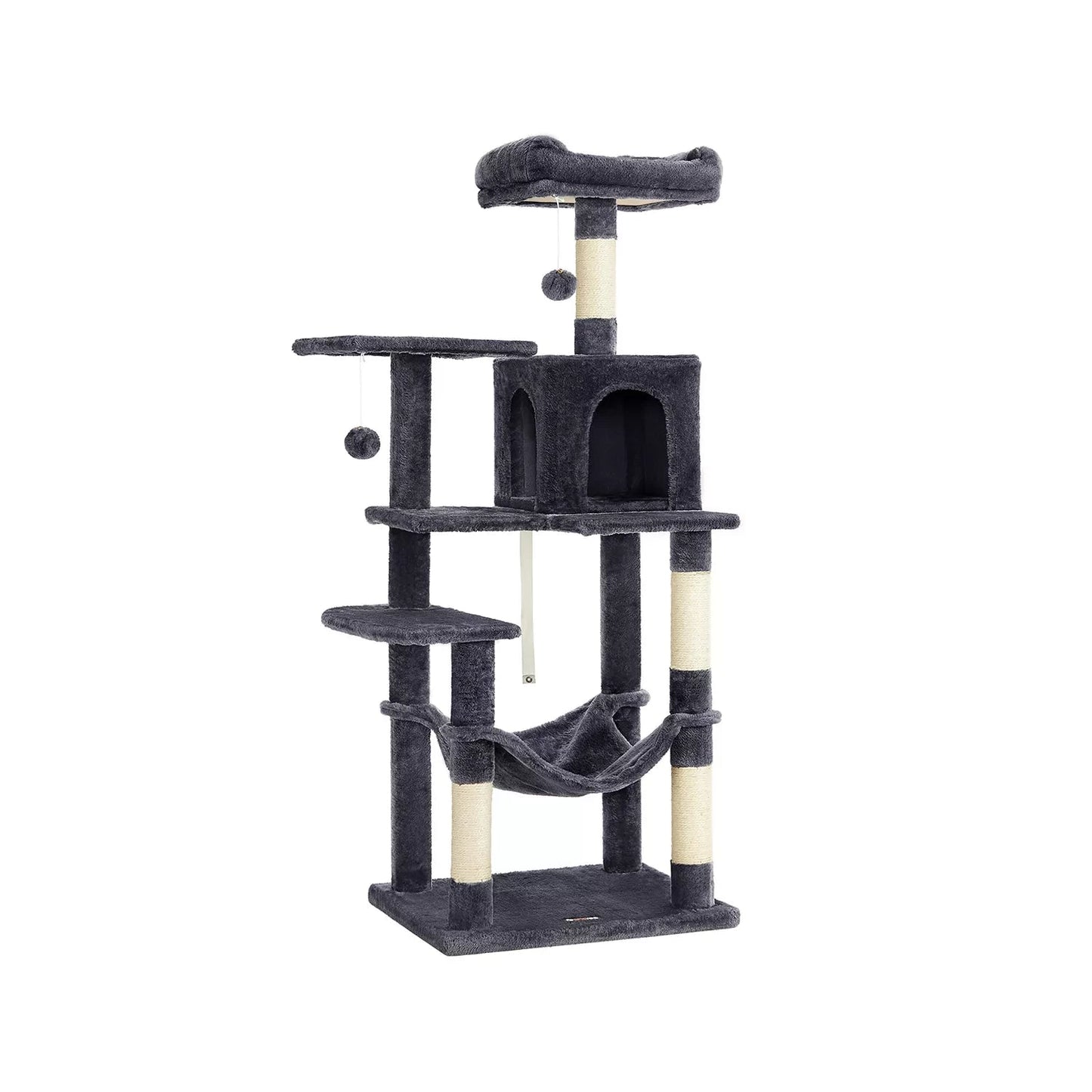 In de creatieve workshops van InAndOutdoorMatch springen twee schattige katjes rond, onderzoeken alle krabpalen persoonlijk en geven hun dier er feedback op. Zo ontdekken de ontwerpers van InAndOutdoorMatch uit de eerste hand of uit de eerste hand of de producten voldoen aan de eisen van verwende snorhaardragers. De highlights van deze krabpaal op een rij: - Slijtvaste en zachte pluche hoes - 1 comfortabele knuffelgrot om in te verstoppen - 1 stabiele hangmat voor dutjes - 1 goed gevoerd uitkijkplatform voor ontspanning - 1 haarbal voor extra speelplezier Productdetails: - Kleur: rookgrijs - Materiaal: spaanplaat, pluche, sisal - Afmetingen: 55 x 45 x 143 cm (L x B x H) - Gewicht: 13 kg Leveringsomvang: - 1 x krabpaal - 1 x anti-tip apparaat - 1 x accessoirepakket - 1 x instructiesInAndOutdoorMatchOpmerkingen: - Als uw katten op haarballen of elastiekjes moeten kauwen, verwijder dan het speelgoed onmiddellijk en bewaar het op een plaats die niet toegankelijk is voor uw kat. - Als het kattenhuis beschadigd is, repareer dan of vervang het op tijd om letsel door beschadigde onderdelen te voorkomen. - Bevestig dit product aan de muur met de meegeleverde anti-kantelsteun om veilig gebruik te garanderen.
