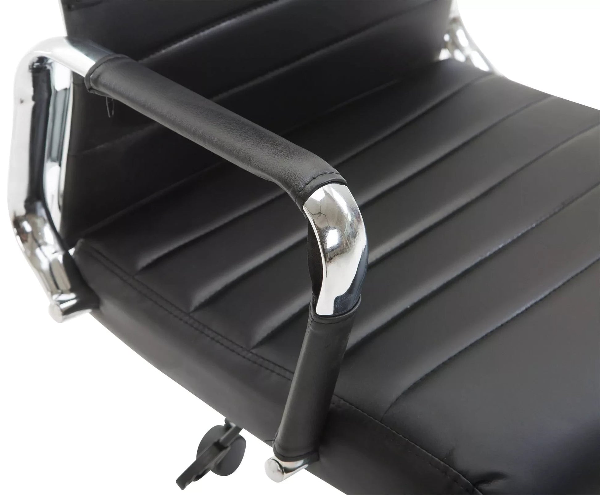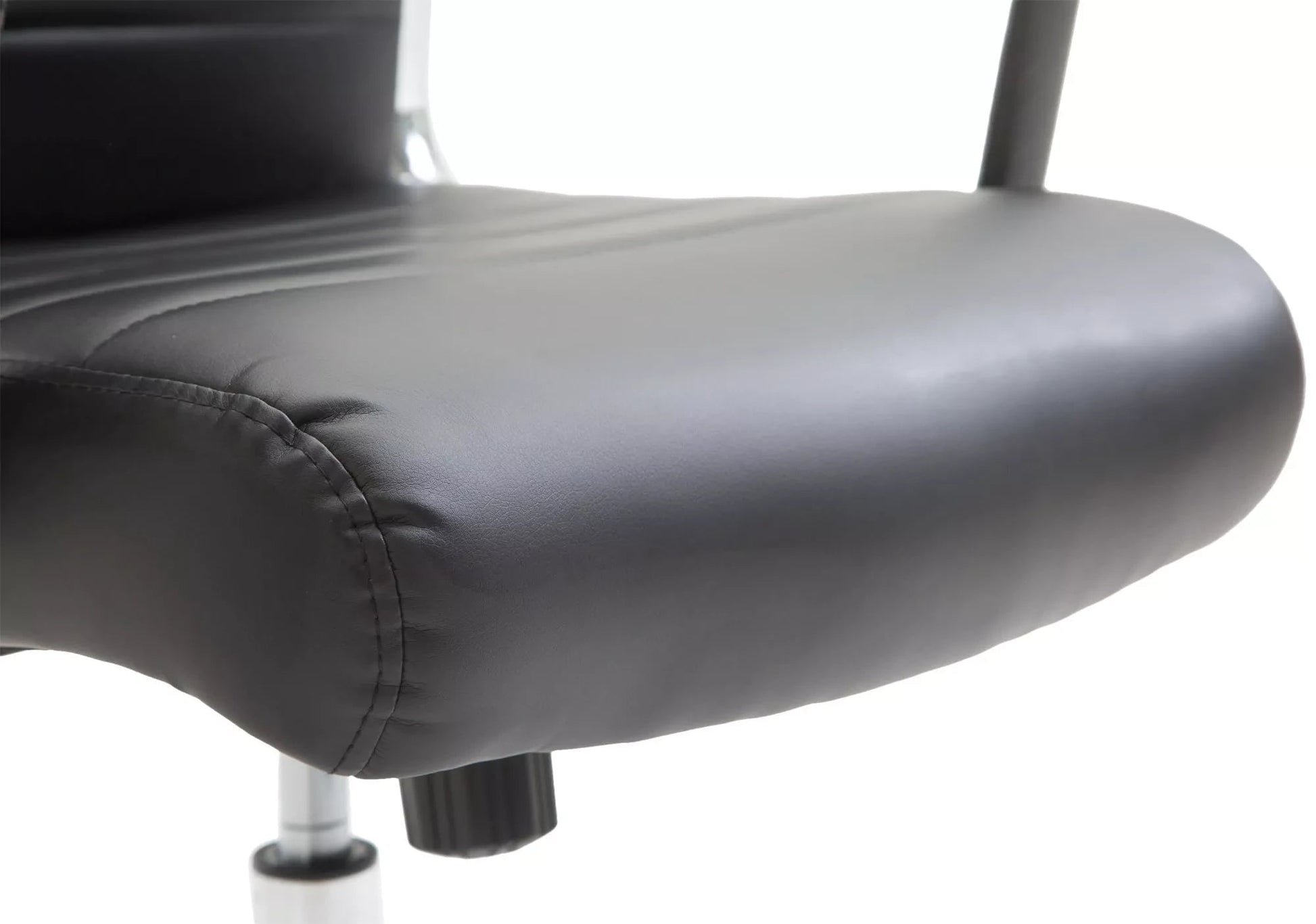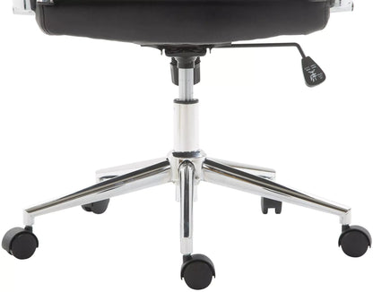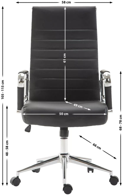 De exclusieve Panfilo Otto bureaustoel overtuigt niet alleen door zijn moderne uitstraling, ook op het gebied van comfort houdt niemand hem voor de gek. De hoogwaardige bekleding en de onderhoudsvriendelijke kunstleren bekleding zorgen ervoor dat u meerdere uren comfortabel kunt zitten. Bovendien is de zithoogte traploos verstelbaar, wat een ergonomische zit garandeert. Verder is de bureaustoel voorzien van een schommelmechanisme dat zorgt voor meer bewegingsvrijheid. Het elegante metalen frame met chroomlook en de stabiele, gebogen armleuningen met kunstleren bekleding geven het geheel net dat beetje extra. De stabiliteit wordt gegarandeerd door het chroomlook metalen frame, dat ook verkrijgbaar is in het zwart met de zwarte kap. Dankzij de vijf lichtlopende wielen rol je gemakkelijk en losjes over de vloer – of het nu op harde vloeren of tapijten is.