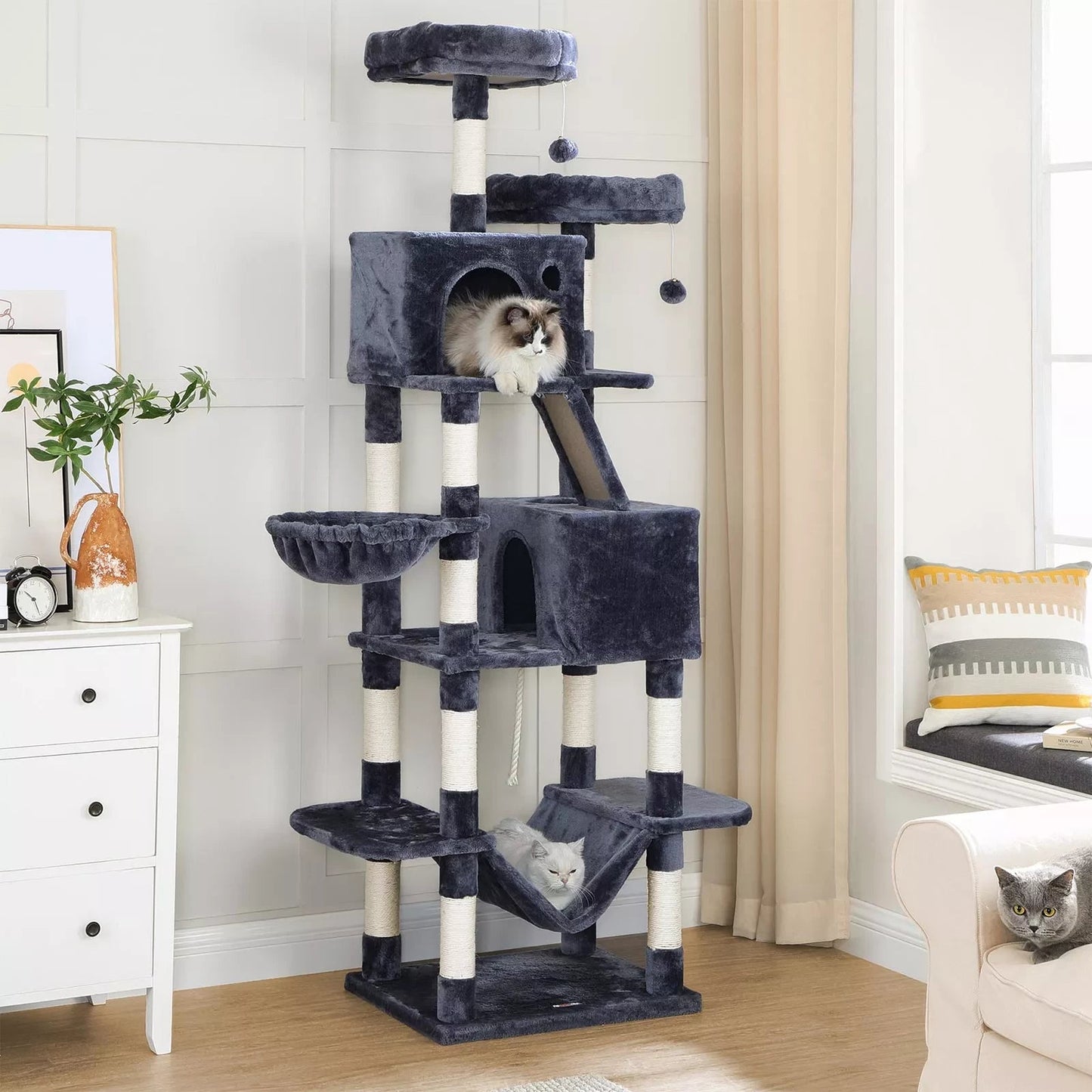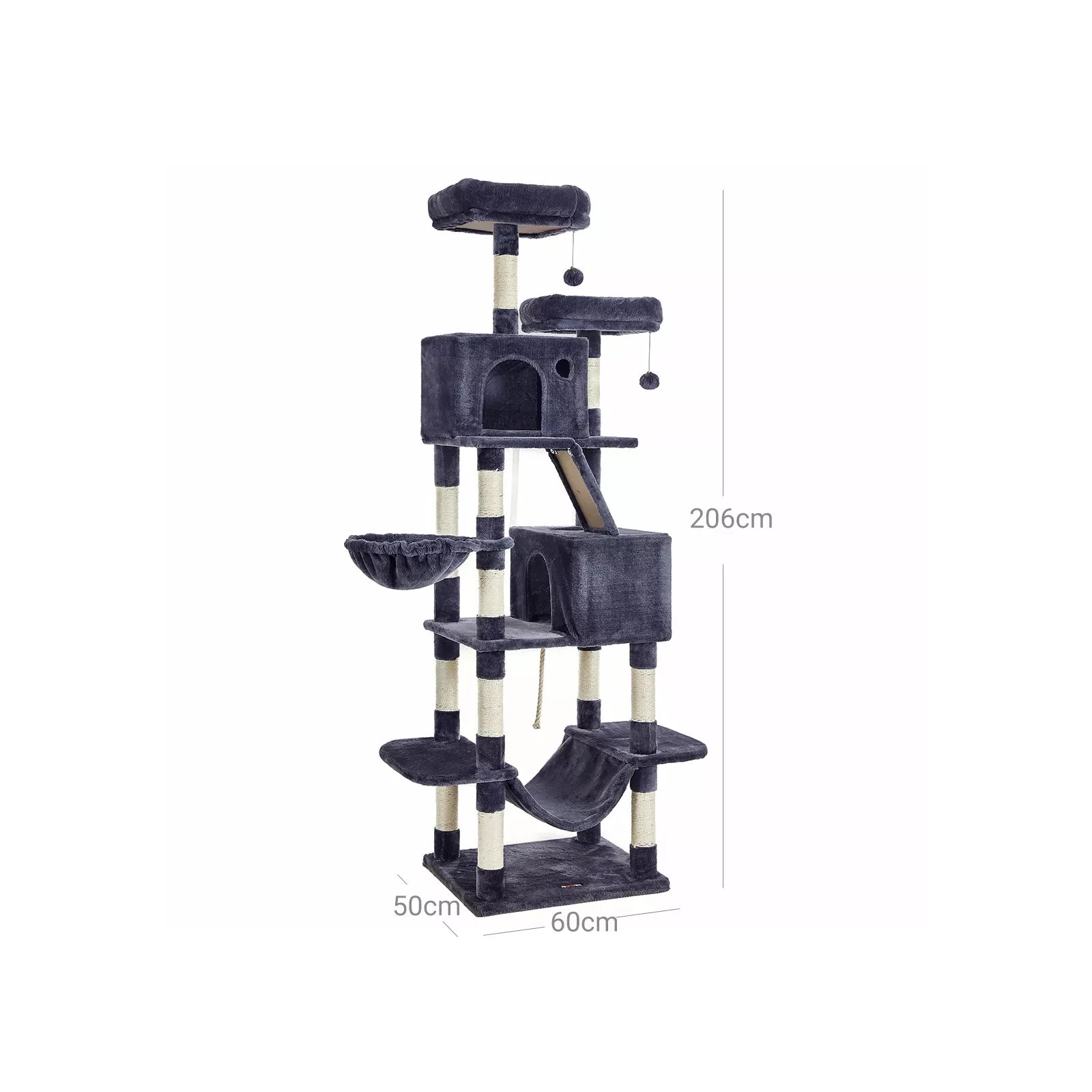 In de creatieve workshops van InAndOutdoorMatch springen twee schattige katjes rond, onderzoeken alle krabpalen persoonlijk en geven hun dier er feedback op. Zo ontdekken de ontwerpers van InAndOutdoorMatch uit de eerste hand of de producten voldoen aan de eisen van verwende snorhaardragers. Uw kat zal veel plezier beleven aan deze krabpaal: 206 cm hoog, perfect voor katten die van hoogte houden 1 hangmat en 1 hangmat om te ontspannen 2 comfortabele knuffelgrotten om sisalstammen te verstoppen en 1 krabplank om de klauwen te scherpen 2 kijkplatforms om te observeren 2 haarballen voor extra speelplezier x Krabpaal1 x Anti-kantelsteun1 x Handleiding (DE,EN,FR,ES,IT)InAndBuiten Wedstrijdopmerkingen:Als het kattenhuis beschadigd is, repareer of vervang het dan op tijd om letsel door beschadigde onderdelen te voorkomen. Als uw katten op het vachtkussen of elastiek kauwen, verwijder dan het speeltje onmiddellijk en bewaar het op een plaats die niet toegankelijk is voor uw kat.