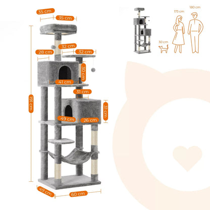 In de creatieve werkplaatsen springen twee schattige katjes rond, onderzoeken alle krabpalen persoonlijk en geven hun dier er feedback op. Zo ontdekken de ontwerpers uit de eerste hand of uit de eerste hand of de producten voldoen aan de eisen van verwende snorhaardragers. De highlights van deze krabpaal op een rij: - Stevige en zachte pluche hoes - 2 goed gevoerde kijkplatforms - 2 comfortabele knuffelgrotten om te verstoppen - 1 zachte hangmat om te ontspannen - Stammen met sisal voor het slijpen van klauwen Productdetails: - Kleur: licht grijs - Materiaal: spaanplaat, pluche, Sisal- Afmetingen: 60 x 49 x 191 cm (L x B x H)- Gewicht: 18,5 kg Leveringsomvang:- 1 x krabpaal- 1 x anti-kiep- 1 x accessoirepakket - 1 x instructies Opmerkingen: - Als uw katten aan de haarbal of het kauwgom zitten, verwijder dan het speeltje onmiddellijk en bewaar het op een plaats die niet toegankelijk is voor uw kat. - Als het kattenhuis beschadigd is, repareer of vervang het dan op tijd om letsel door beschadigde onderdelen te voorkomen. - Bevestig dit product aan de muur met de meegeleverde anti-tip om veilig gebruik te garanderen.