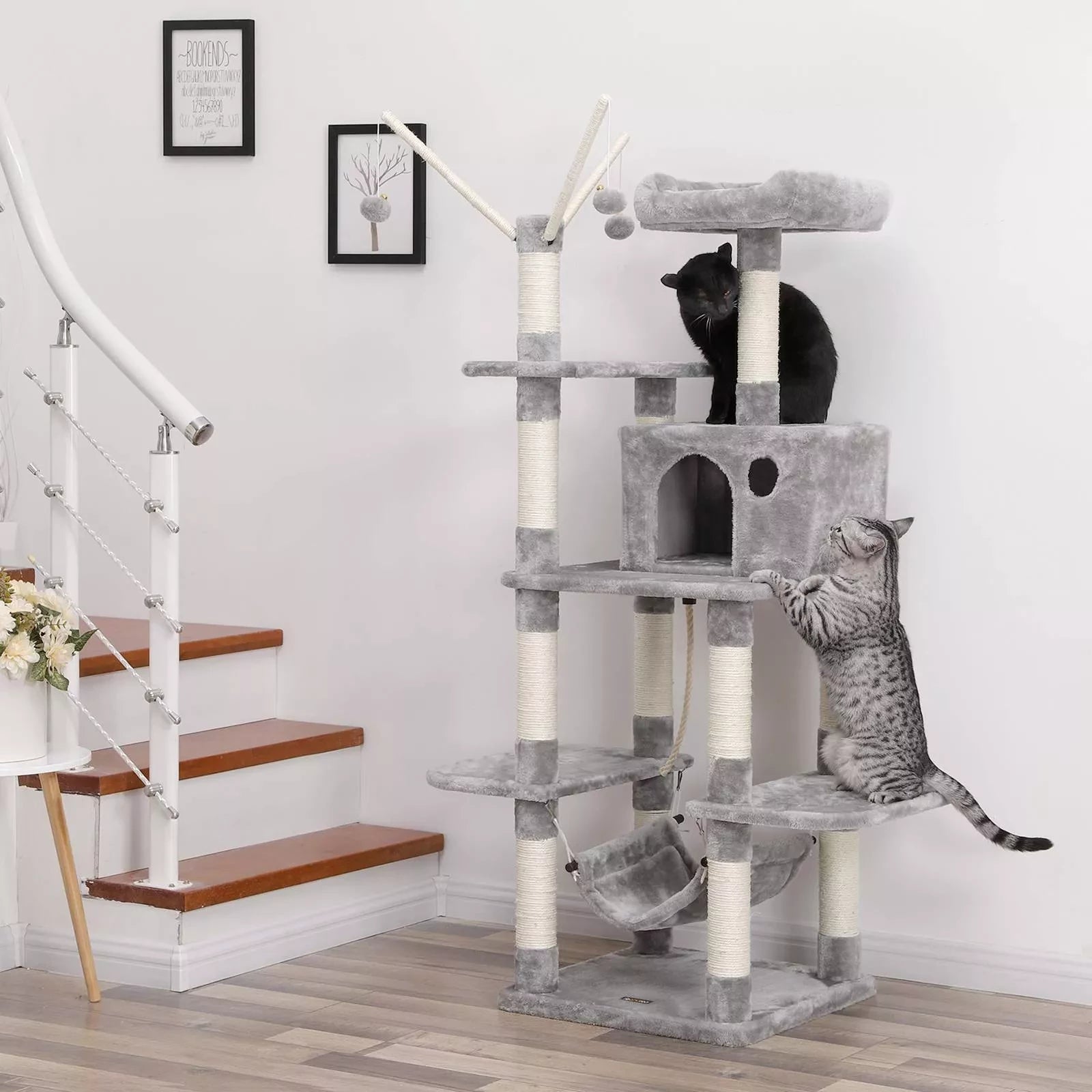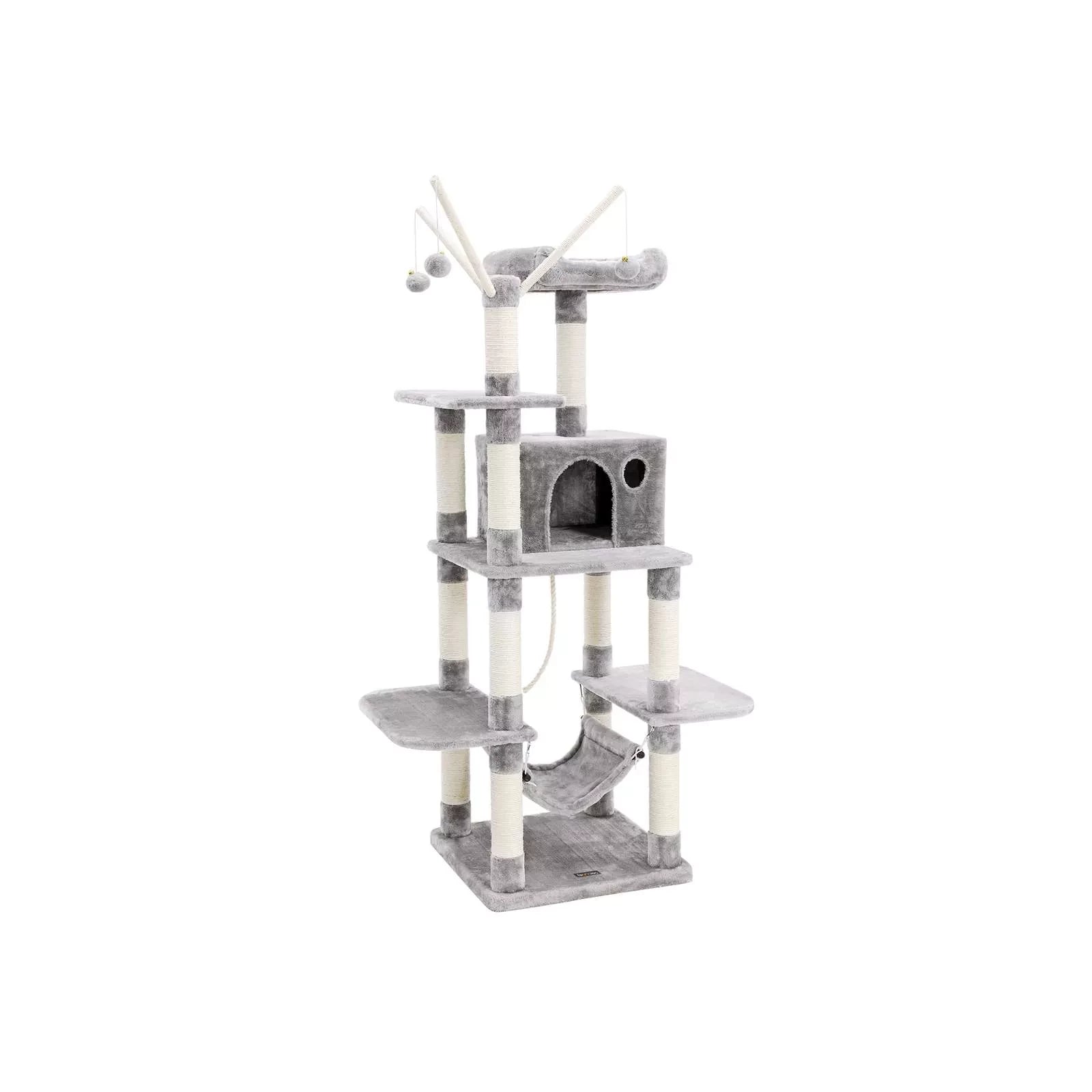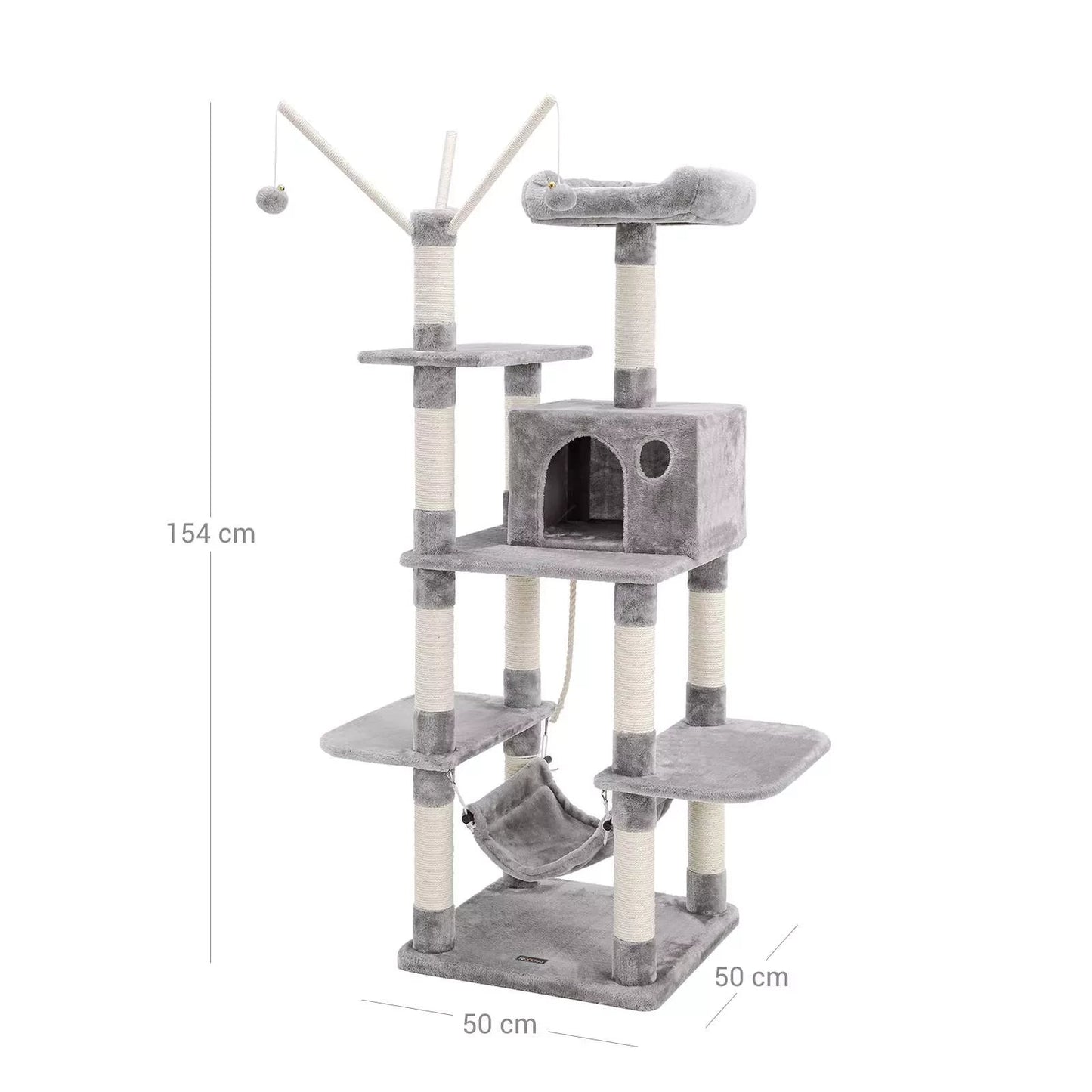 Productdetails: Kleur: lichtgrijs Materiaal: spaanplaat + pluche + sisal Totale hoogte: ca. 50 cm Afmetingen grot: ca. 50 cm. Afmetingen vierkant platform: ca. 35 x 25 x 30 cm (B x H x D). 36 x 36 cm Afmetingen ovaal platform (2 x): ca. 50 x 30 cm per stuk Gewicht: ca. 16,9 kg Leveringsomvang: 1 x krabpaal 1 x handleiding (DE, EN, FR, IT, ES)
