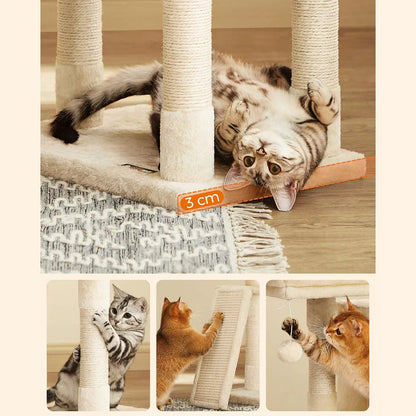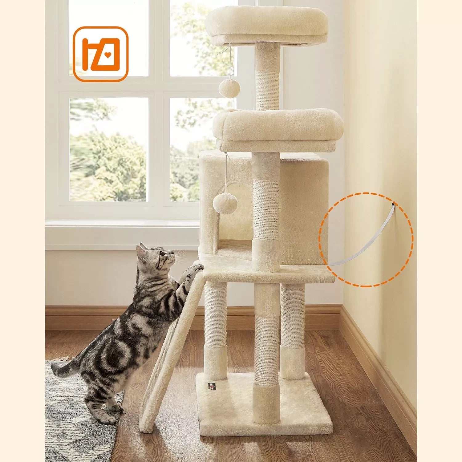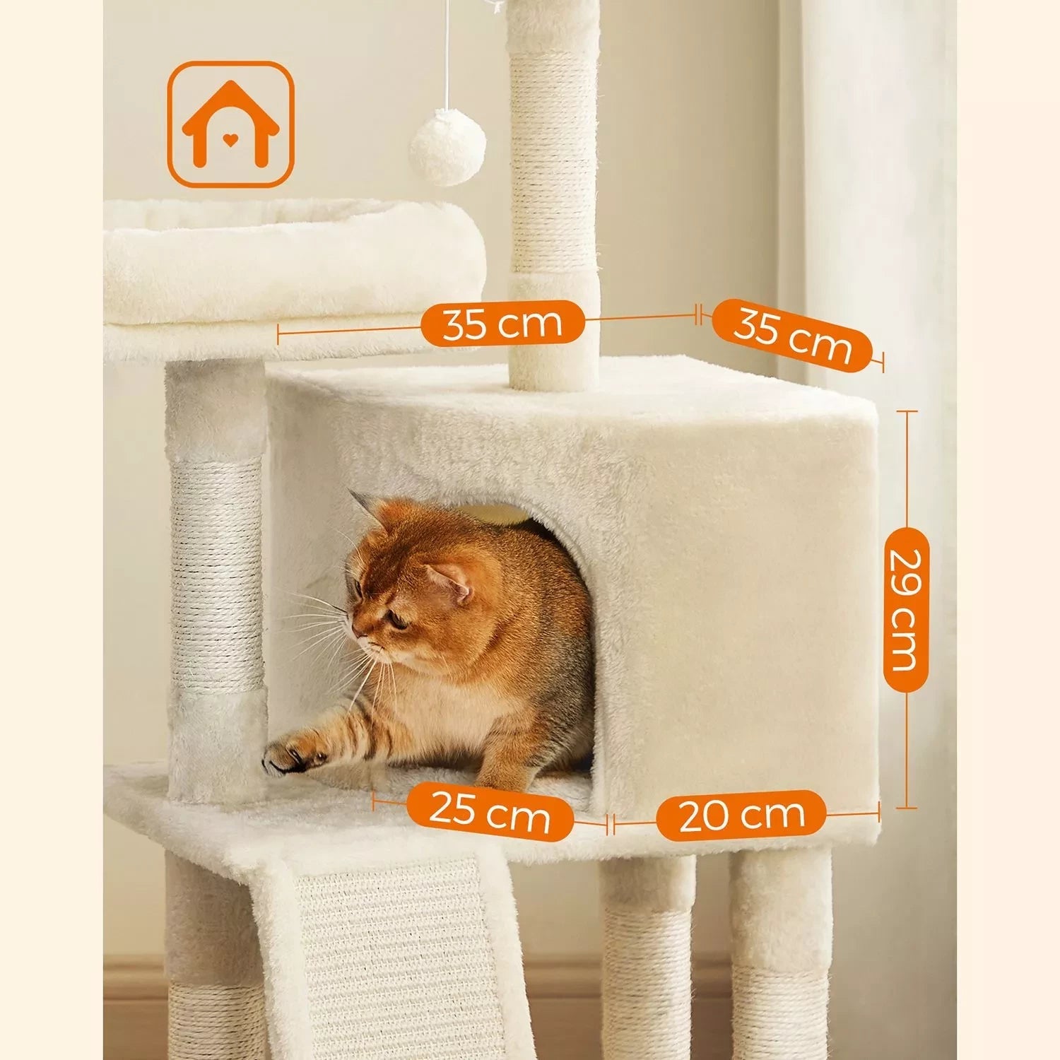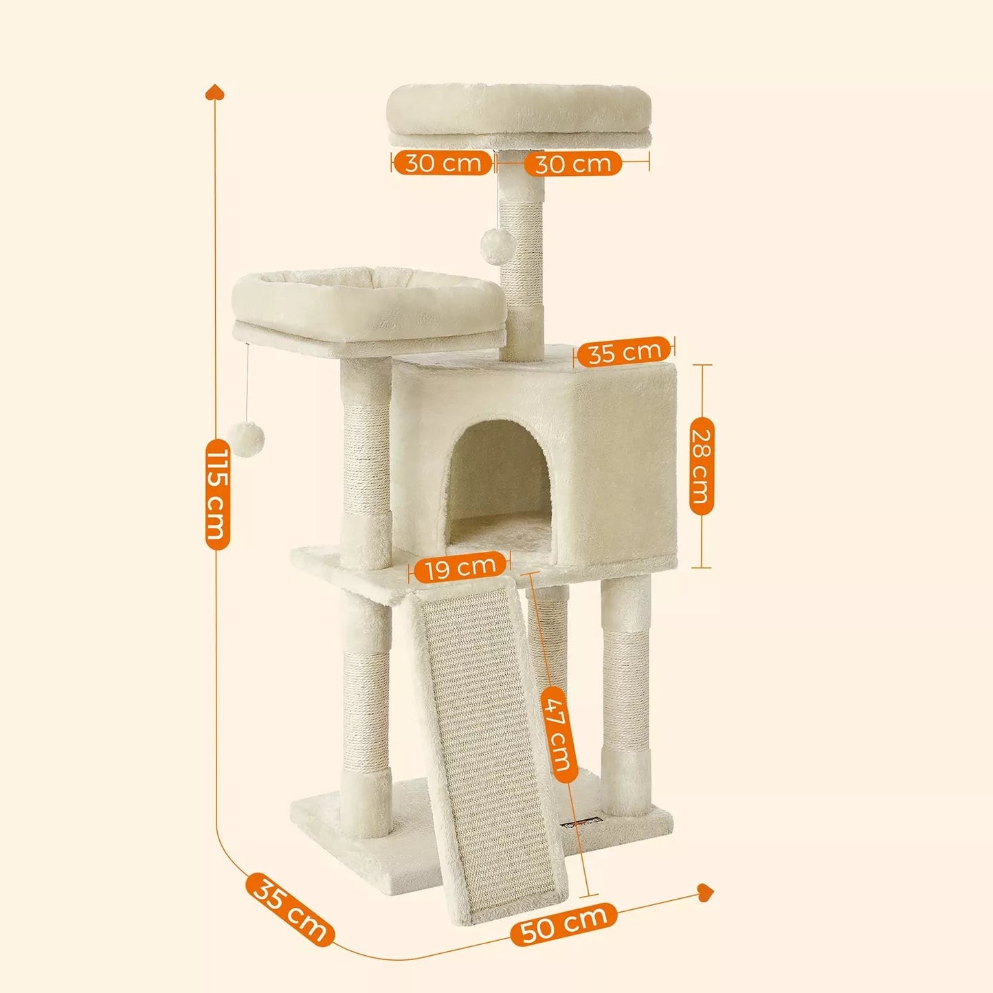 In de creatieve workshops van InAndOutdoorMatch springen twee schattige katjes rond, onderzoeken alle krabpalen persoonlijk en geven hun dier er feedback op. Zo ontdekken de ontwerpers van InAndOutdoorMatch uit de eerste hand of uit de eerste hand of de producten voldoen aan de eisen van verwende snorhaardragers. Uw lieve kat kan genieten van de volgende kenmerken: - 2 uitkijkplatforms bovenaan voor observatie - 1 comfortabel nestje om verstoppertje te spelen - Boomstammen met sisal op elk niveau om de klauwen te slijpen - 1 grote krabplank die tevens dienst doet als trap - Gelaagde constructie voor gemakkelijk op- en afstappen - 2 haarballen voor extra speelplezier Productdetails: - Kleur: beige - Materiaal: spaanplaat, pluche, sisal - Afmeting: 50 x 35 x 115 cm (L x B x H) - Gewicht: 10,3 kg Leveringsomvang: - 1 x Krabpaal - 1 x Anti-kantelapparaat - 1 x Handleiding InAndOutdoorMatch Opmerkingen: - Als het kattenhuis beschadigd is, repareer of vervang het dan op tijd om letsel door beschadigde onderdelen te voorkomen. - Als uw katten erop kauwen verwijder het speelgoed onmiddellijk en bewaar het op een plaats die niet toegankelijk is voor uw kat.