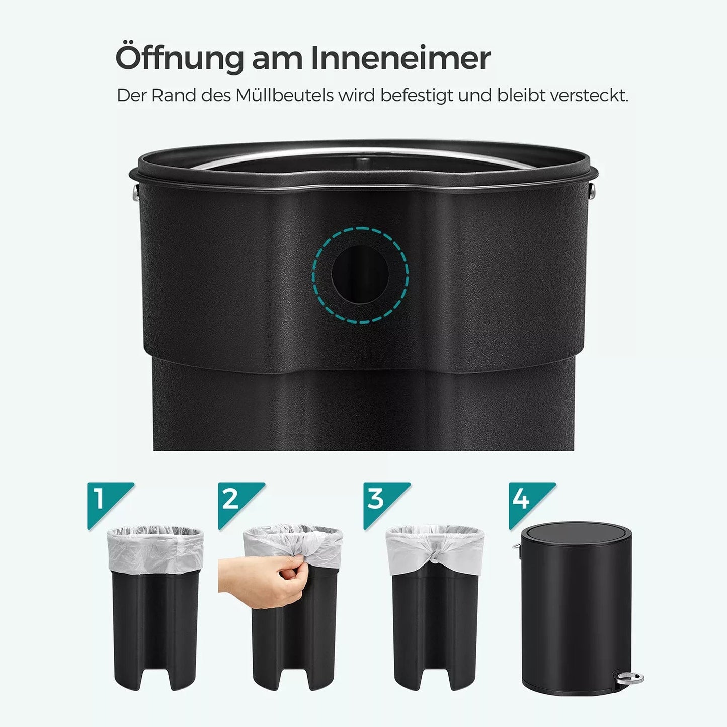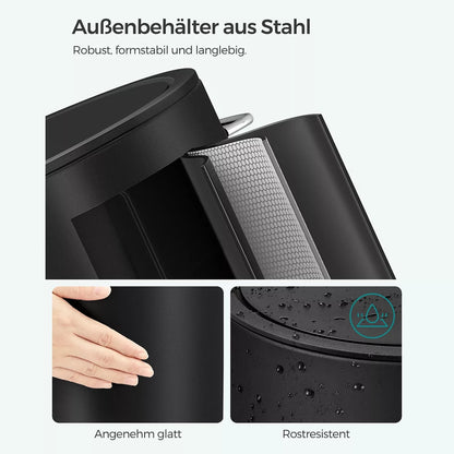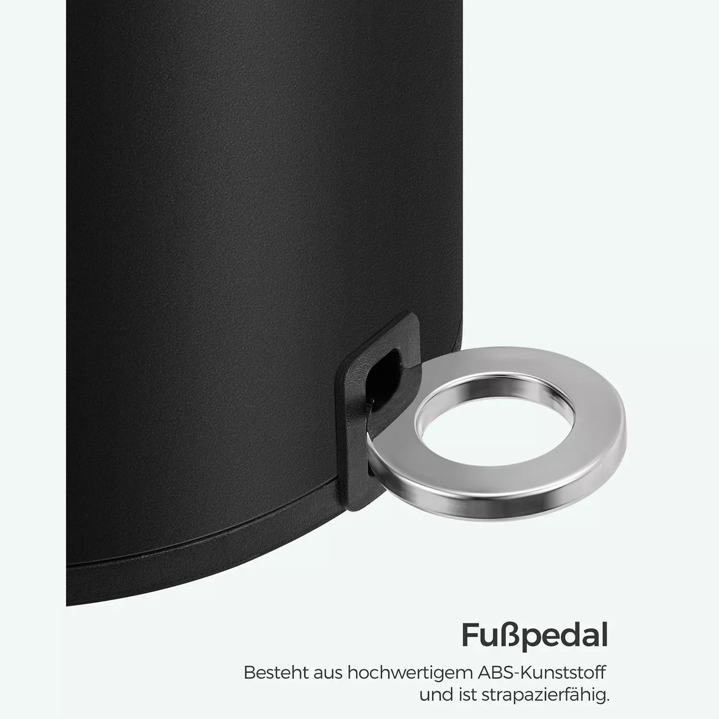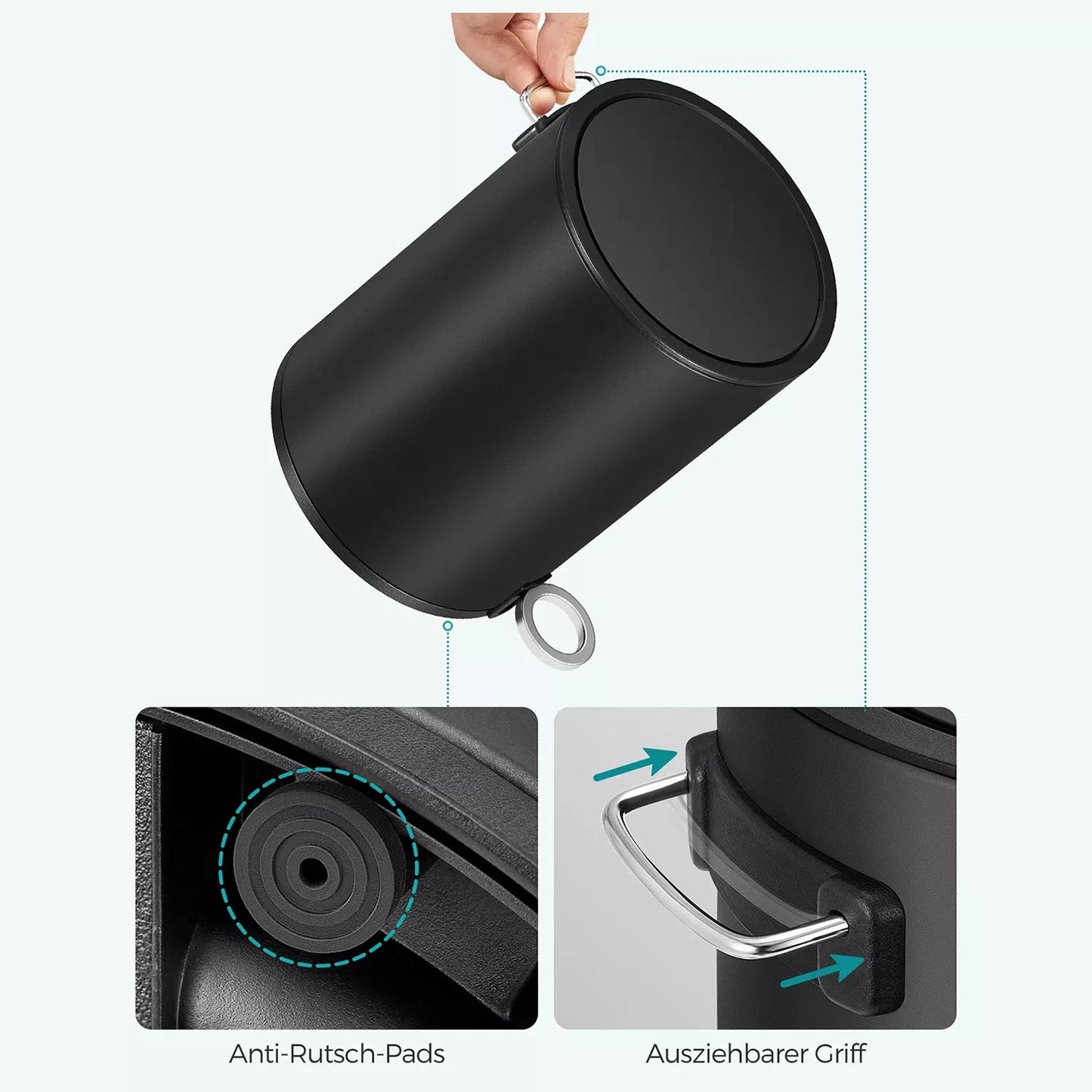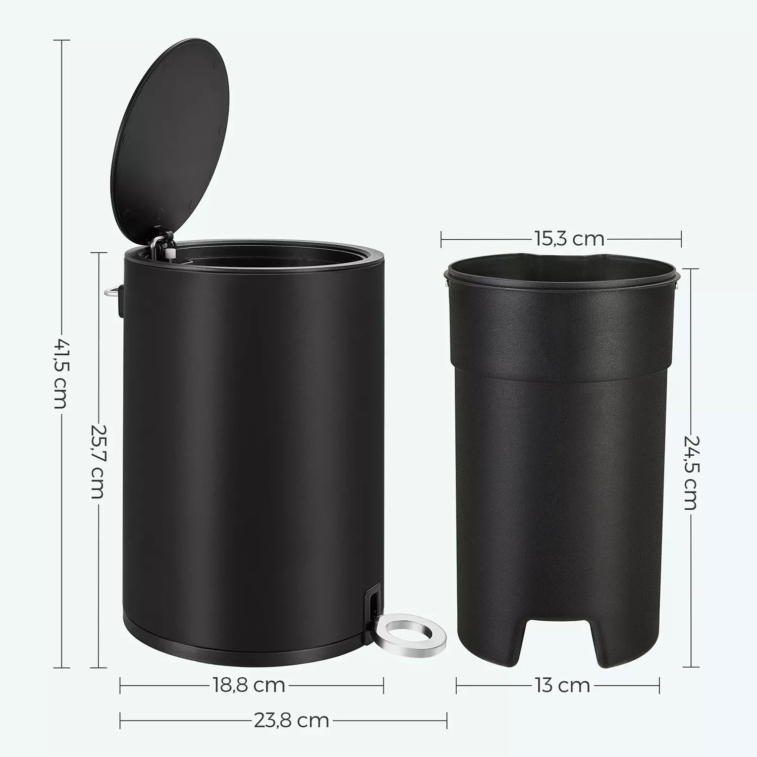 De highlights van deze 3 liter cosmetica-emmer voor de badkamer op een rij: Zacht en geruisloos sluitend deksel Stevig en duurzaam voetpedaaloppervlak van staal, gemakkelijk schoon te maken Binnenemmer met handvat, eenvoudig te verwijderen Opening aan de binnenemmer: houdt het afval vast tas strak gespannen zodat deze van buitenaf niet zichtbaar is Uittrekbare handgreep aan de achterzijde, voor eenvoudig transport van de pedaalemmer Antislippads, zodat de pedaalemmer niet wegglijdt en uw vloer beschermd is tegen krassen Productdetails: Kleur: ZwartMateriaal: Buitenbak van staal, deksel van ABS-kunststof, binnenemmer van PP-kunststofAfmetingen (met voetpedaal): 23,8 x 18,8 x 25,7 (L x B x H)Afmetingen (zonder voetpedaal): 18,8 x 18,8 x 25,7 cm (L x B x H) Totale hoogte (met open deksel): 41,5 cm Gewicht: 0,8 kg Inhoud van de verpakking: 1 x cosmeticabak In en Outdoor Match Opmerkingen: Om het product schoon te maken, veegt u het af met een licht vochtige doek en droogt u het af met een zachte doek. Indien nodig kunt u ook een mild wasmiddel gebruiken.