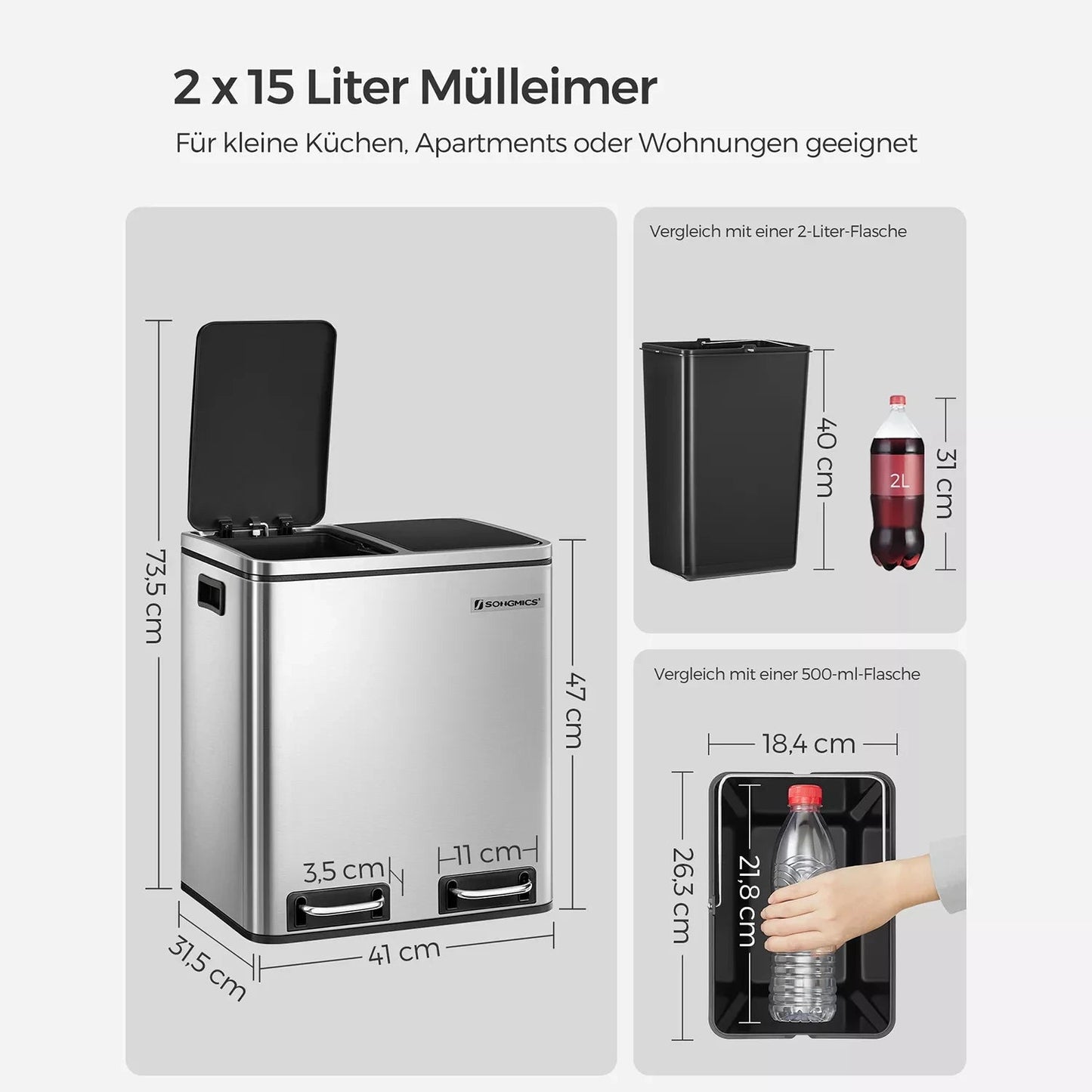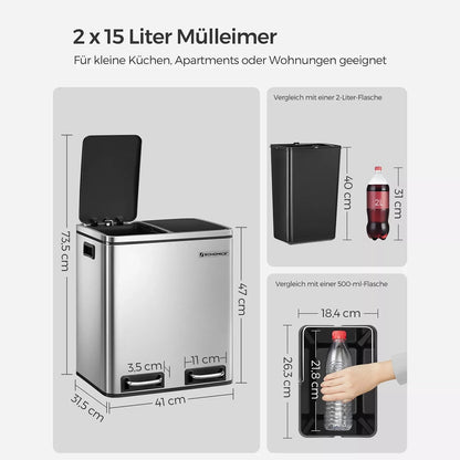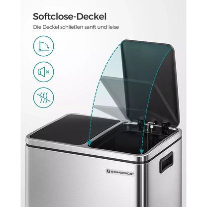 Robuuste en duurzame roestvrijstalen behuizing (dikte 0,35 mm) verhoogt de drukweerstand, de eenvoudig te reinigen behuizing is corrosiebestendig. Dankzij twee handgreepinzetstukken verplaats je de afvalbak gemakkelijk. De deksel van milieuvriendelijk kunststof sluit de bak goed af, dankzij het ergonomische dekselontwerp gaat de bak gemakkelijk open en sluit hij geruisloos. De binnenemmers kun je eruit halen, erg handig voor het verplaatsen van afval en het legen van de bakken. De voetpedalen zijn stabiel en duurzaam. De antislip- en waterdichte voetstandaard beschermt uw vloer tegen krassen. Productdetails: Materiaal: Mat RVS (behuizing) + PP kunststof (binnenemmer) + ABS kunststof (deksel) Buitenafmetingen: 41 x 47 x 36 cm (B x H x D) Afmetingen Binnenemmer: 26,5 x 40,5 x 18 cm (B x H x D) Afmetingen deksel volledig geopend: 41 x 73,5 x 36 cm (B x H x D) Afmetingen voetpedaal: 11,5 x 4 cm; Buis: 1 cm Kleur: zilver (behuizing), zwart (binnenemmer, deksel) Nettogewicht: 5,1 kg Brutogewicht: 8,6 kg Leveringsomvang: 1 x afvalbak