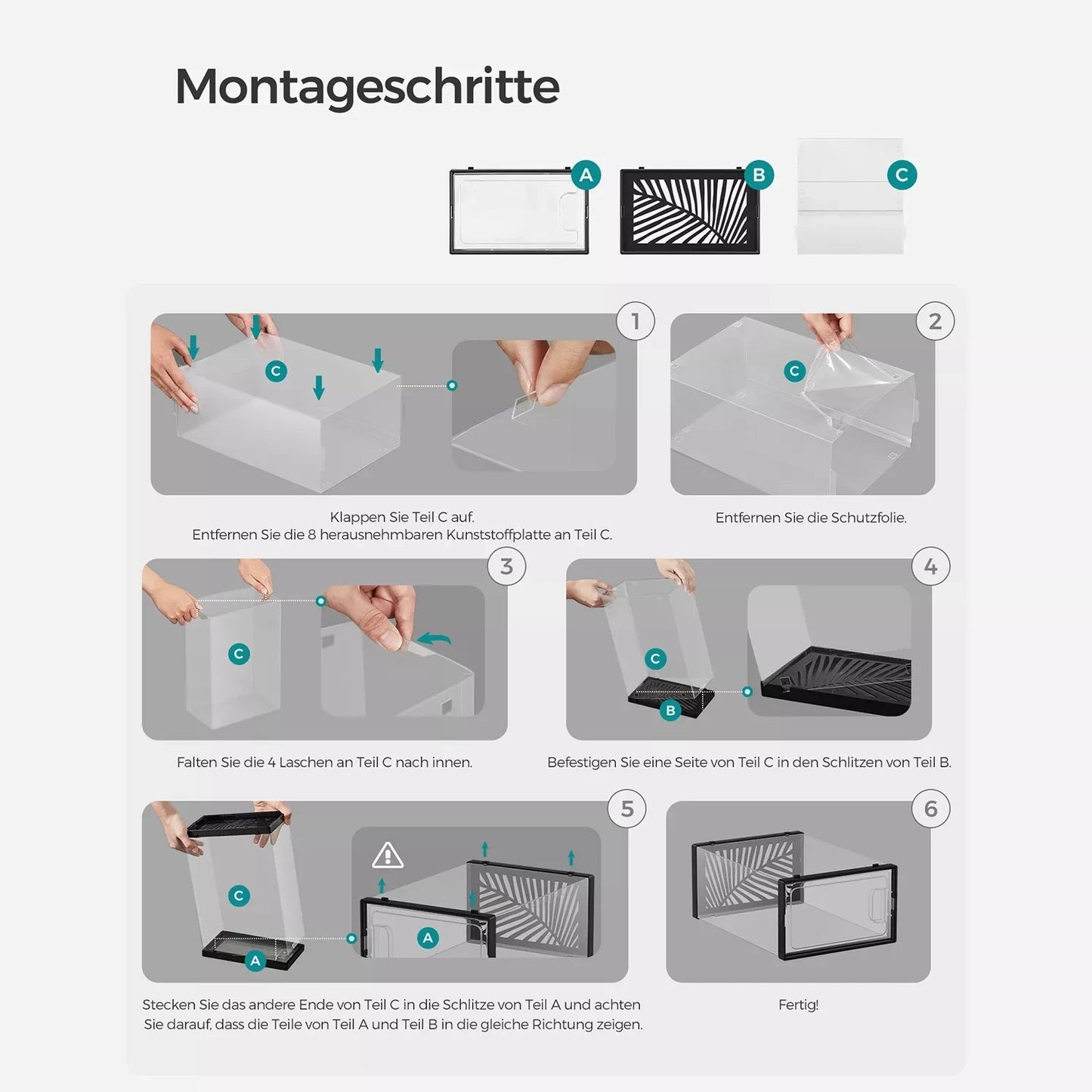 Productdetails: - Kleur: transparant zwart - Materiaal: PET-body, ABS-frame - Afmeting per schoenendoos: 33,5 x 23 x 14 cm (D x B x H) - Binnenmaat per schoenendoos: 30 x 22,6 x 13,5 cm (D x B x H) - Totaal gewicht: 6,9 kg Leveringsomvang: - 18 x schoenendoos - 1 x Inand Outdoormatch-instructies Opmerkingen: - Monteer het product strikt volgens de instructies. - Meet uw schoenen vooraf op voordat u ze koopt en zorg ervoor dat ze in deze schoenendozen passen.