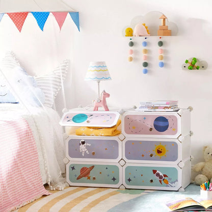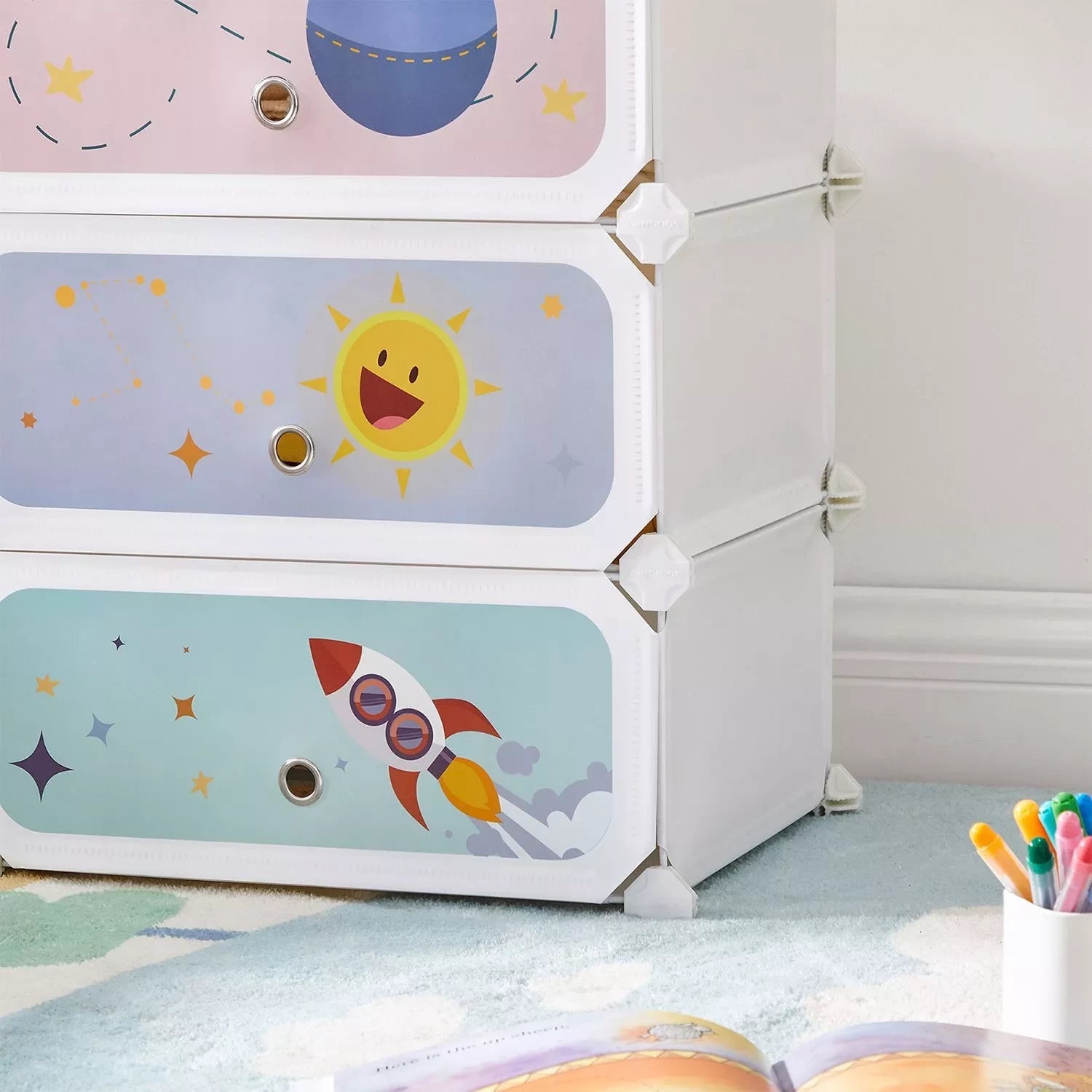 Een positieve invloed op kinderen Fancy patronen, frisse kleuren en liefdevolle kubussen Als uw kinderen geïnteresseerd zijn in de ruimte of graag spelenderwijs leren, zal deze schoenenkast zeker een stortvloed aan enthousiasme veroorzaken en kinderen aanmoedigen om zelf hun spullen op te ruimen. De kamer zal stralen als nieuw! Productdetails: - Kleur: wit - Materiaal: PP-kunststofplaat, metalen frame, ABS-kunststof connector - Afmeting van twee rijen: 83 x 31 x 54 cm (L x B x H) - Afmeting van elke rij: 43 x 31 x 105 cm (L x B x H) - Afmeting per compartiment: 40 x 30 x 17 cm (L x B x H) - Gewicht: 4,4 kg - Max. statische belasting per kubus: 10 kg - Max. statisch draagvermogen totaal: 80 kg. Leveringsomvang: - 8 x kunststof bord (40 x 30 cm) - 6 x kunststof bord (40 x 17 cm) - 12 x kunststof bord (30 x 17 cm) - 6 x Tr (40 x 17 cm) - 28 x ABS-kunststof connectoren - 1 x hamer - 1 x anti-tip - 1 x instructies (DE,EN,FR,IT,ES)Inand Outdoormatch Opmerkingen:- Bevestig het product aan de muur met behulp van de meegeleverde anti-tip.- Voor kinderen jonger dan 3 al jaren niet meer geschikt. Kinderen ouder dan 3 jaar mogen het product alleen gebruiken onder toezicht van volwassenen. - Alle plastic panelen moeten tijdens de montage helemaal naar beneden worden gedrukt. Controleer na het voltooien van elke rij of de draadframes helemaal in de connector zijn geduwd om de stabiliteit van het product te vergroten.