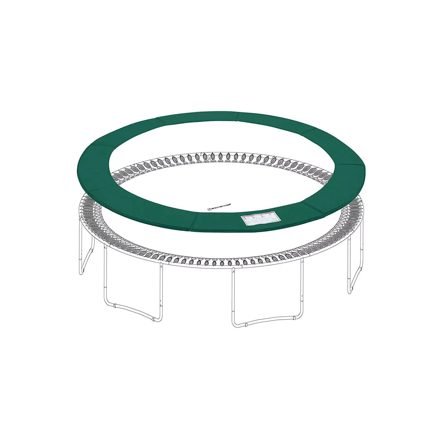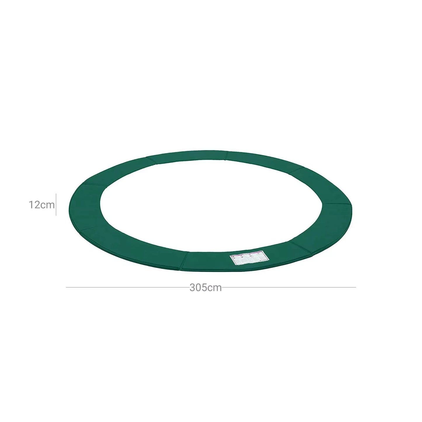 De randafdekking van Songmic is gemaakt van hoogwaardig materiaal en heeft een lange levensduur. Het PVC-oppervlak en het binnenste EPD-schuim maken deze hoes waterdicht, scheurvast en vormvast. Uw veiligheid is het allerbelangrijkst. Als je de hoes lang geleden hebt meegenomen of er zitten al scheuren in, maak je trampoline dan klaar voor een nieuwe hoes. Songmics randafdekking met nieuw ontwerp kan verwondingen bij het vallen tegen de veren of het frame voorkomen, zodat kinderen of volwassenen goed beschermd kunnen worden. Productdetails: Materiaal: - oppervlak: groen - onderkant: PE-kunststof - het midden van de hoes is voorzien van vulling van 15 mm dik en 300 mm breed. Afmetingen: - buitendiameter: 305 cm - binnendiameter: 245 cm Leveringsomvang: - 1 x randafdekking