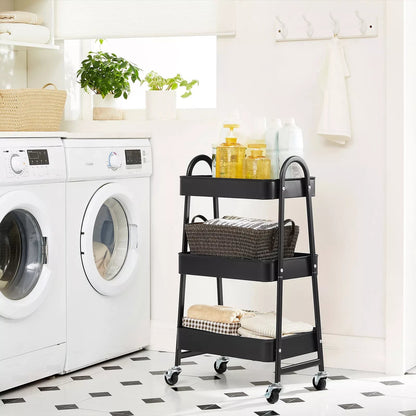 In And OutdoorMatch Trolley Alyce - 3 niveaus - Serveerwagen - Keukentrolley - Met Handvat - 2 Kleine Hangvakken - 2 Remmen - Kunststof Opbergvakken - Zwart