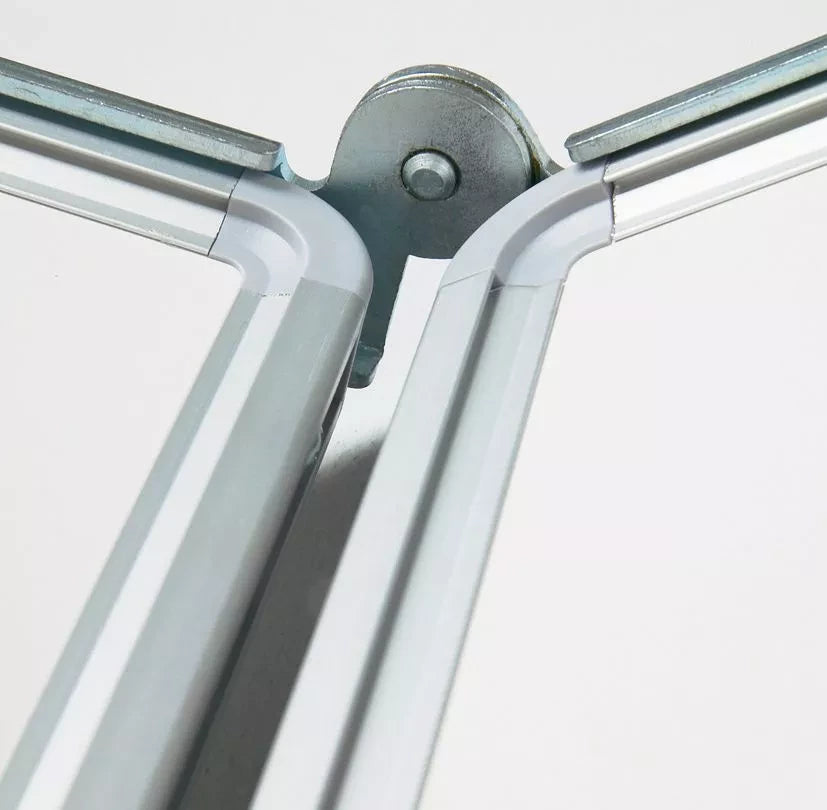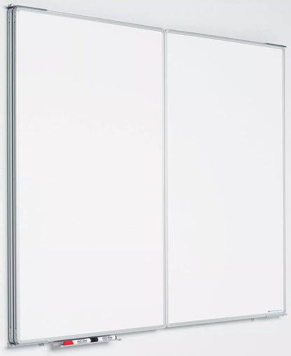 Whiteboard met vijf schrijfoppervlakken van wit geëmailleerd staal (800C). Extra vleugels zorgen voor meer schrijfruimte. Geanodiseerd aluminium RC-profiel met grijze kunststof hoekstukken. Inclusief afstortbak.